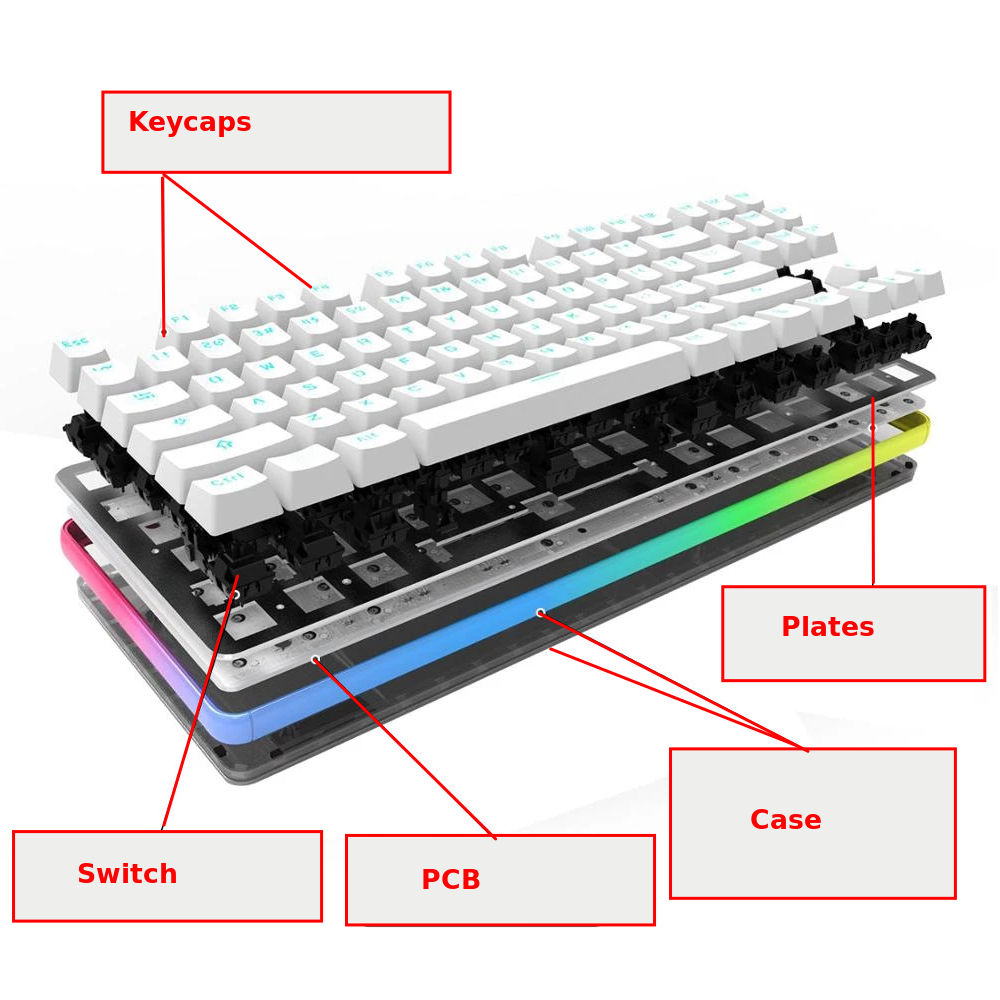 Bàn phím cơ cấu tạo cũng không quá phức tạp. Cơ bản thì có vài thành phần chính theo hình dưới này:
