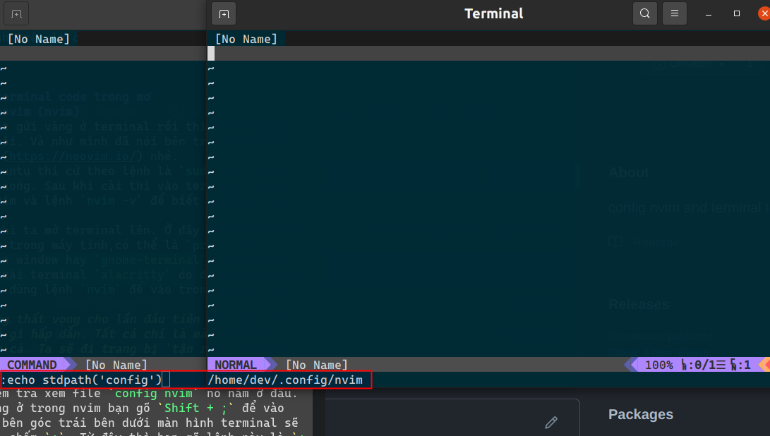 Đầu tiên là kiểm tra xem file config nvim nó nằm ở đâu. Vậy thì khi đang ở trong nvim bạn gõ Shift + ; để vào chế độ gõ lệnh bên góc trái bên dưới màn hình terminal sẽ hiện ra dấu hai chấm :. Từ đây thì bạn gõ lệnh này là :echo stdpath('config') và sau đó sẽ hiện ra kết quả chính là nơi mà nvim sẽ load toàn bộ thiết lập cấu hình cho nó khi sử dụng.