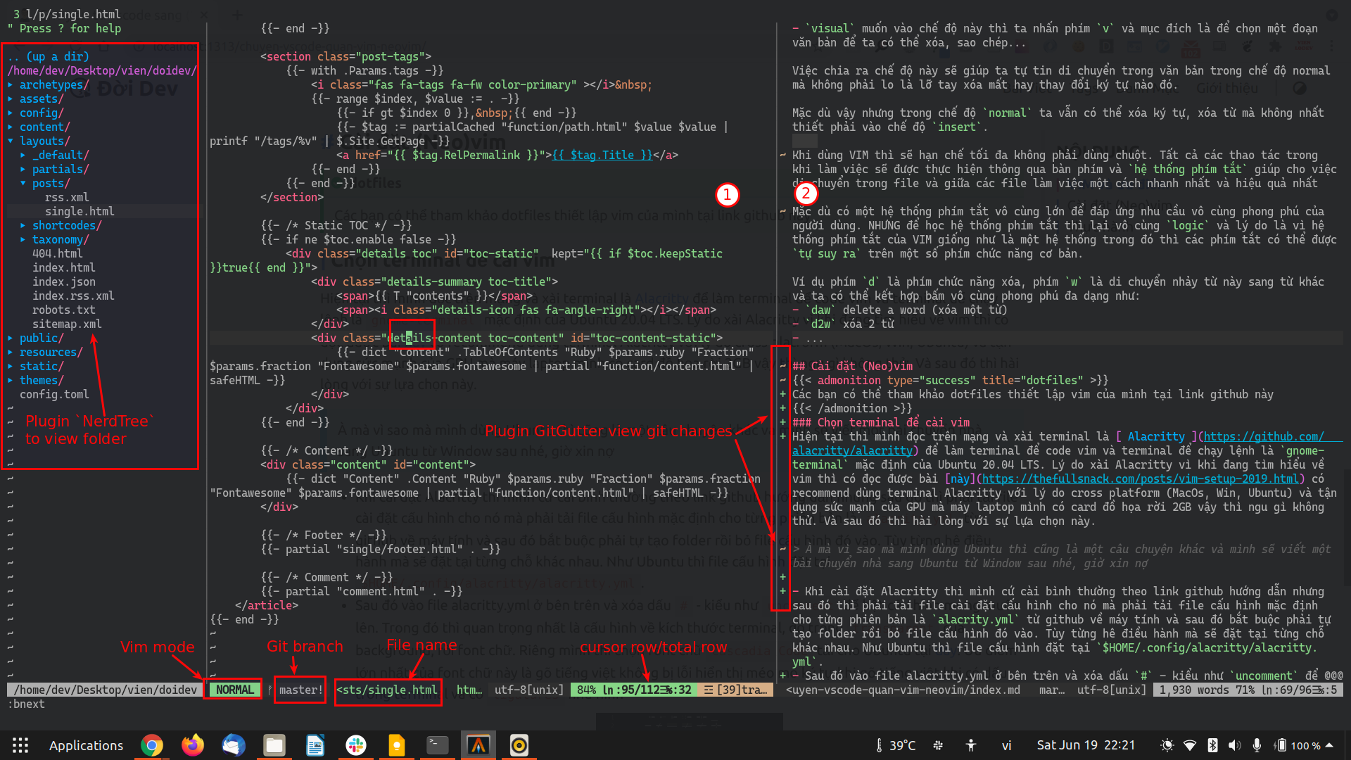 Trong hình thì mình có folder với plugin nerdtree nhưng thật sự ít xài cái này. Có chia màn hình ra 2 cột, rồi có thể xem git branch, xem status git của file đang chọn nhanh chóng với plugin gitgutter. Có transparent background cho terminal. Rồi khi con trỏ cursor nó di chuyển vào chữ màu gì thì nó cũng chuyển sang màu đó luôn, ví dụ trong hình trên là con trỏ có màu xanh lá cây vì đang ở chữ có màu xanh lá cây.