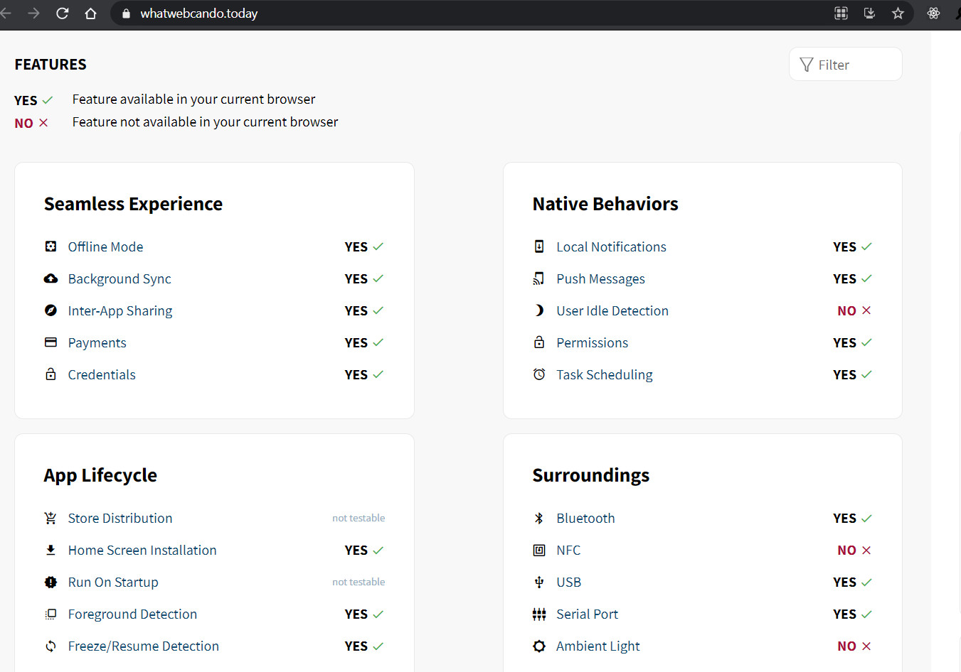 PWA cũng có những khả năng như cài đặt vào màn hình chính (dạng icon mà không chiếm nhiều dung lượng lưu trữ như ứng dụng app ), có khả năng đẩy thông báo. Để có thể có cái nhìn tổng quan và so sánh thì các bạn có thể xem PWA có thể làm được gì với hình bên dưới.