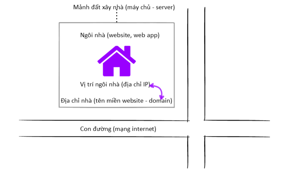 Thường thì những nhà cung cấp dịch vụ web hosting đã cài đặt phần mềm cần thiết và đảm bảo địa chỉ IP cố định cho website để mọi người có thể truy cập tới trang web. Nhưng địa chỉ IP là một dãy số khó nhớ (ví dụ: 192.168.118.114) do đó nên để cho dễ dàng hơn thì thường ta sẽ gắn một địa chỉ tên miền website (ví dụ: tenmiencuaban.com) vào địa chỉ IP của máy chủ nơi mà bạn host website. Do đó thay vì phải gõ địa chỉ IP trên thanh trình duyệt để truy cập vào website thì bây giờ người dùng chỉ cần gõ tên miền website thôi. Quá trình bên trên có thể mô tả bằng hình như sau: